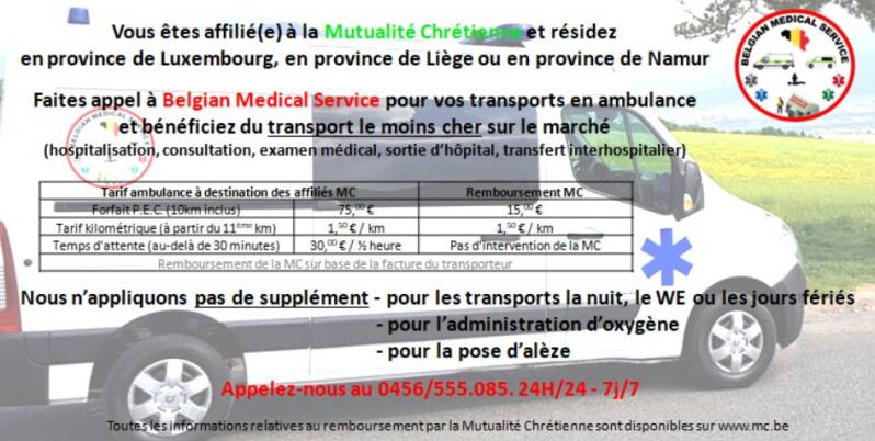 Par ailleurs, les affiliés de la Mutualité Chrétienne bénéficient d'un tarif préférentiel pour leurs transports en ambulance depuis et/ou vers un centre hospitalier (en Wallonie, à Bruxelles, en Flandre ou au Grand-Duché de Luxembourg)